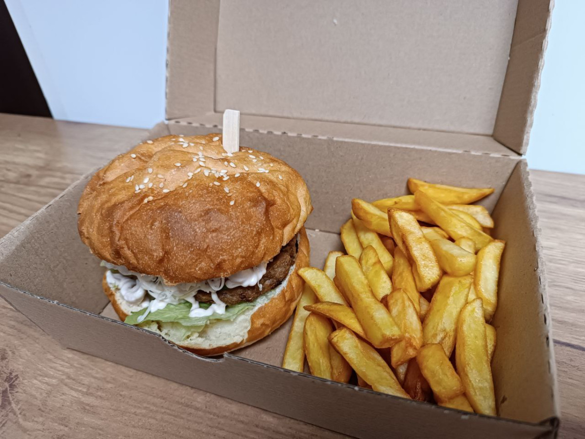 Hamburger zsemle, Hamburgerhús, Hamburgerszósz, Hasábburgonya, Jégsaláta, Lilahagyma, Paradicsom, Trappista sajt, Uborka