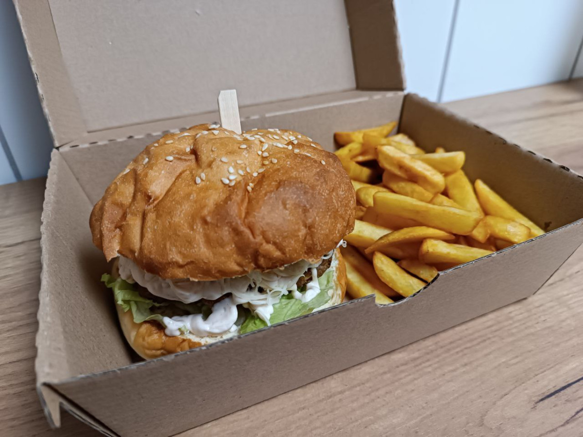 Hamburger zsemle, Hamburgerhús, Hamburgerszósz, Hasábburgonya, Jégsaláta, Lilahagyma, Paradicsom, Pirított bacon, Pirított kolbász, Trappista sajt, Uborka