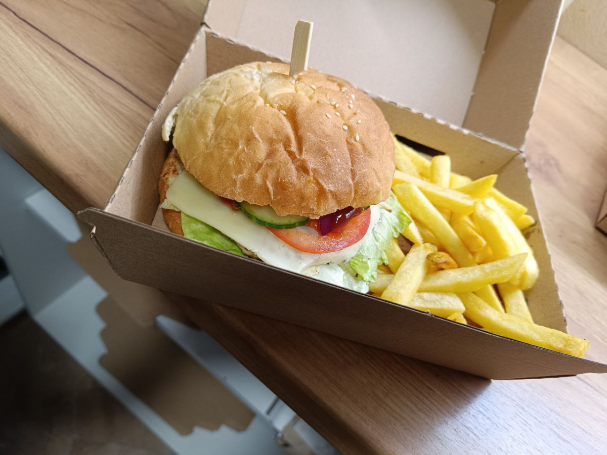 Hamburger zsemle, Hamburgerhús, Hasábburgonya, Jégsaláta, Ketchup, Lilahagyma, Mustár, Paradicsom, Trappista sajt, Uborka