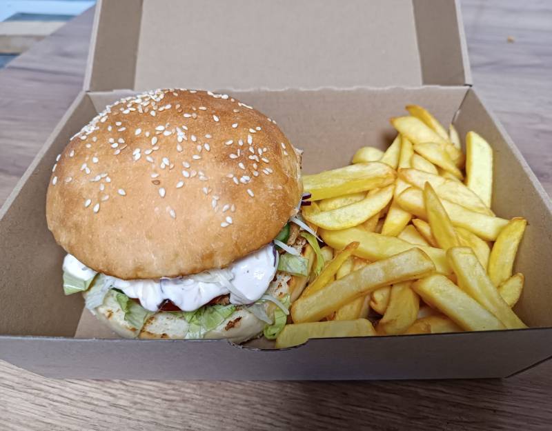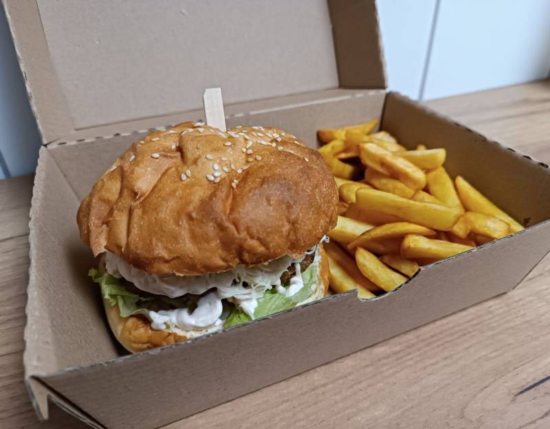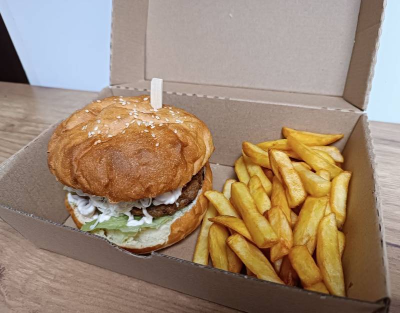 Hamburger zsemle, Hamburgerhús, Hamburgerszósz, Hasábburgonya, Jégsaláta, Lilahagyma, Paradicsom, Uborka